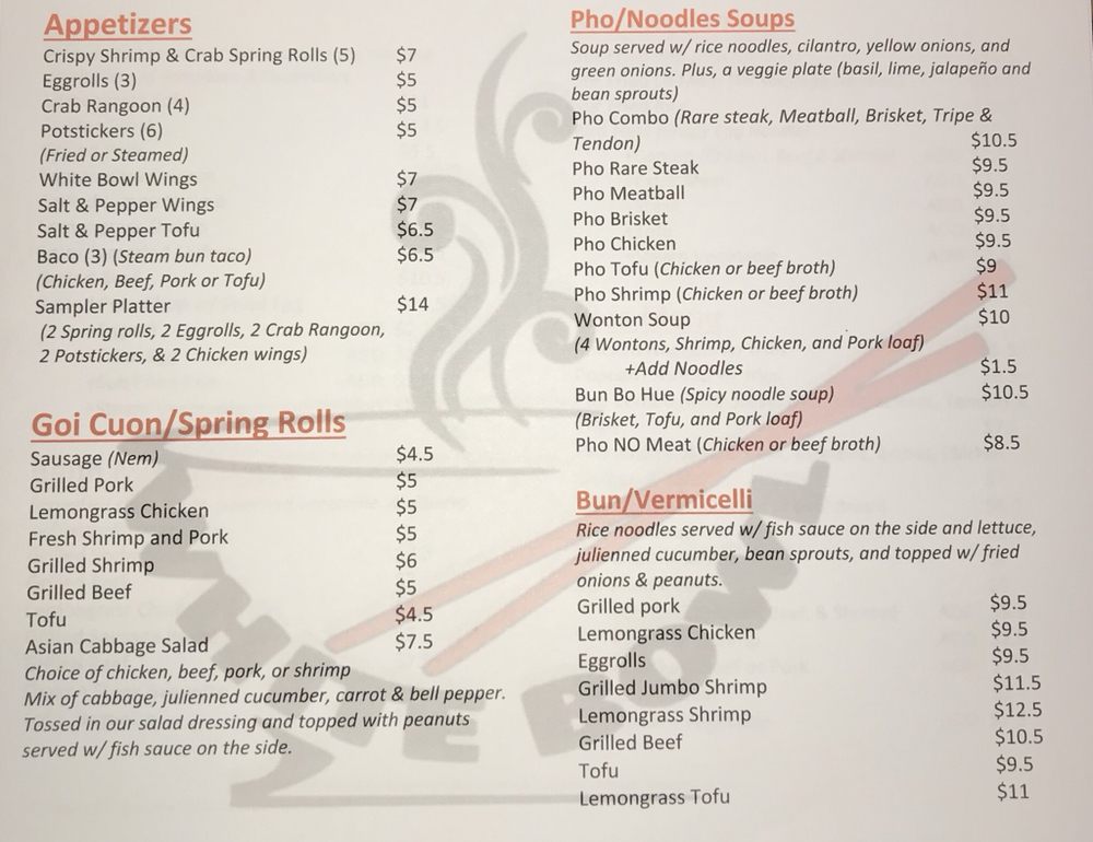 White Bowl is a Vietnamese restaurant located in Houma, LA, offering a range of delicious and authentic dishes. Known for their amazing food and great customer service, White Bowl caters to various dietary preferences with many vegetarian options available. The restaurant boasts a clean and welcoming atmosphere, with ample free parking and wheelchair accessibility. Customers rave about the fresh ingredients used in their dishes, such as the crispy crab and shrimp spring rolls and the flavorful chicken pho. The menu also includes unique dishes like the birds nest with beef and the bun bo hue, making White Bowl a go-to spot for Vietnamese cuisine enthusiasts. With quick service, great Happy Hour specials, and the option for takeout and catering, White Bowl is a must-visit destination for those craving authentic Vietnamese flavors.